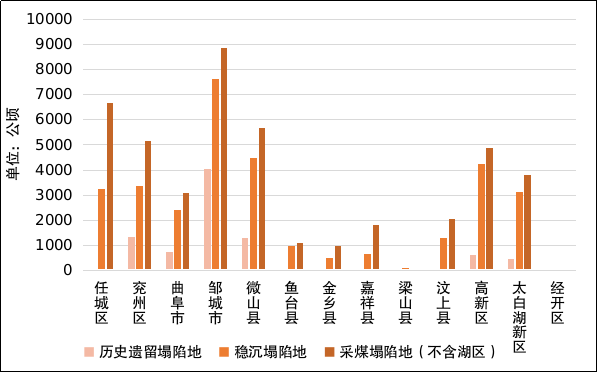 截至2020年底,济宁市采煤沉陷区规模为65418.85公顷,采煤塌陷地为52311.25公顷,其中历史遗留采煤塌陷地为8375.80公顷。南四湖外,采煤沉陷区规模为55818.87公顷,采煤塌陷地为44175.47公顷,其中稳沉采煤塌陷地为31947.57公顷。由于南四湖内的采煤塌陷地可自然修复,不再列入本规划治理范围。