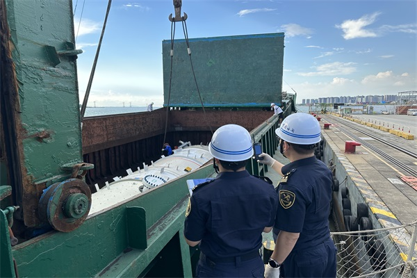 图为:关员正在对进口的大型特种设备”加氢反应器“进行船边监管 招伟锋/摄