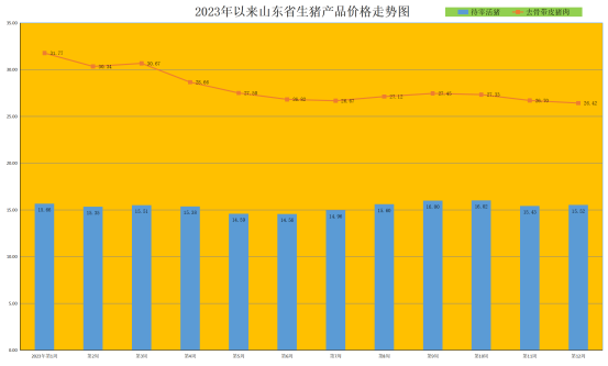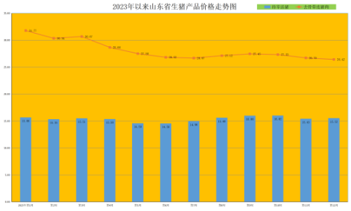 第12周(3月20日-3月26日),我省生猪周均价窄幅震荡,呈现先回落后回升的变化。据对全省26个集贸市场价格定点监测,第12周全省肥猪出栏均价为15.52元/公斤,同比升高27.00%,环比回升0.58%。猪肉价格继续承压回落,本周猪肉均价为26.42元/公斤,同比升高14.72%,环比回落1.05%。