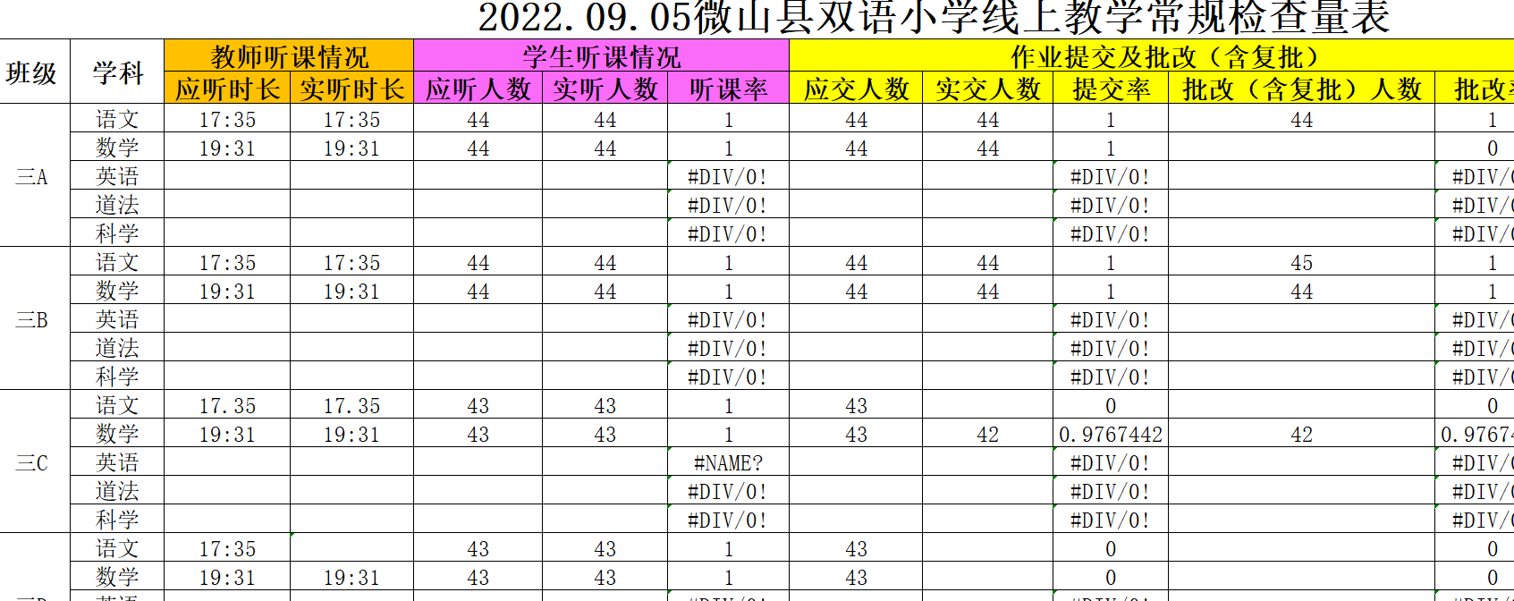 为了促进老师们更加积极地参与线上教学,提高工作效率,双语小学设计了线上教学常规检查量表。表格涵盖教师听课时间、学生听课与作业完成情况、教师小课堂次数及时长等丰富的内容,让任课教师各项工作的完成情况一目了然。