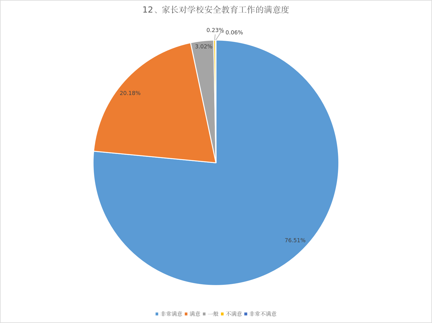 12、家长对学校安全教育工作的满意度。被调查的家长中,非常满意的1342票,占比76.51%;满意的354票,占比20.18%;一般的53票,占比3.02%;不满意的1票,占比1.11%;非常不满意1票,占比0.06%。家长们普遍对学校安全教育工作满意。