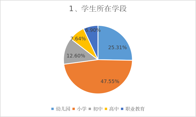 1、被调查孩子所在学段。被调查孩子中,幼儿园幼儿444票,占比25.31%;小学生834票,占比47.55%;初中生221票,占比12.6%;高中生134票,占比7.64%;职业中专学生121人,占比6.9%。小学、幼儿园参与调查较多。