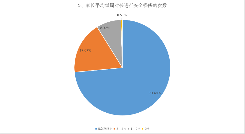 5、平均每周对孩子进行安全提醒的次数。被调查家长中,达到五次以上的1289票,占比73.49%;3-4次的310票,占比17.67%;1—2次的146票,占比8.32%;0次的9票,占比0.51%。每周对孩子进行安全提醒的次数3-4以上占比90%以上。