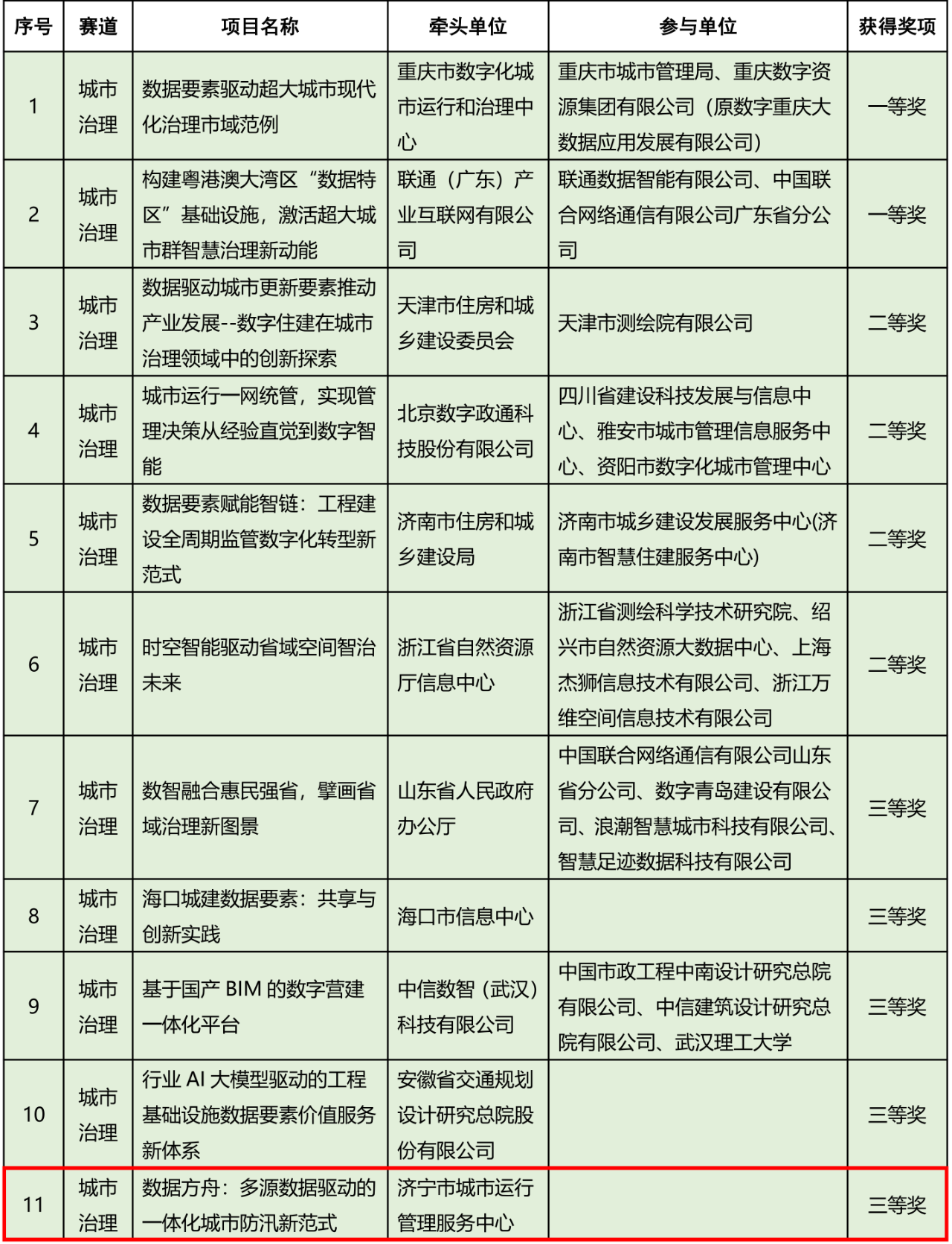近日,2025年“数据要素×”大赛全国总决赛圆满落幕,济宁市城市运行管理服务中心申报的参赛作品《数据方舟:多源数据驱动的一体化城市防汛新范式》斩获“城市治理”赛道三等奖。