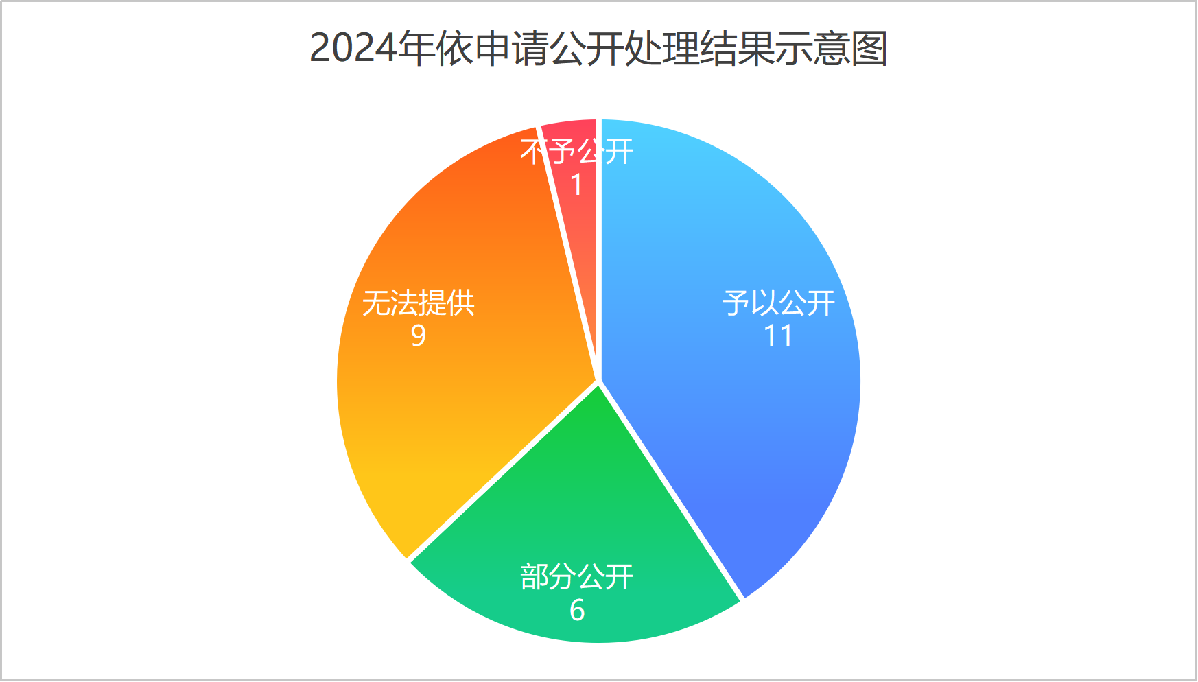 从办理结果看,予以公开11件、占40.74%,部分公开6件、占22.22%,因本机关不掌握无法提供9件、占33.33%,因属于国家秘密不予公开1件,占3.71%。所有办件均不收取费用,均未引发行政复议和行政诉讼事件。