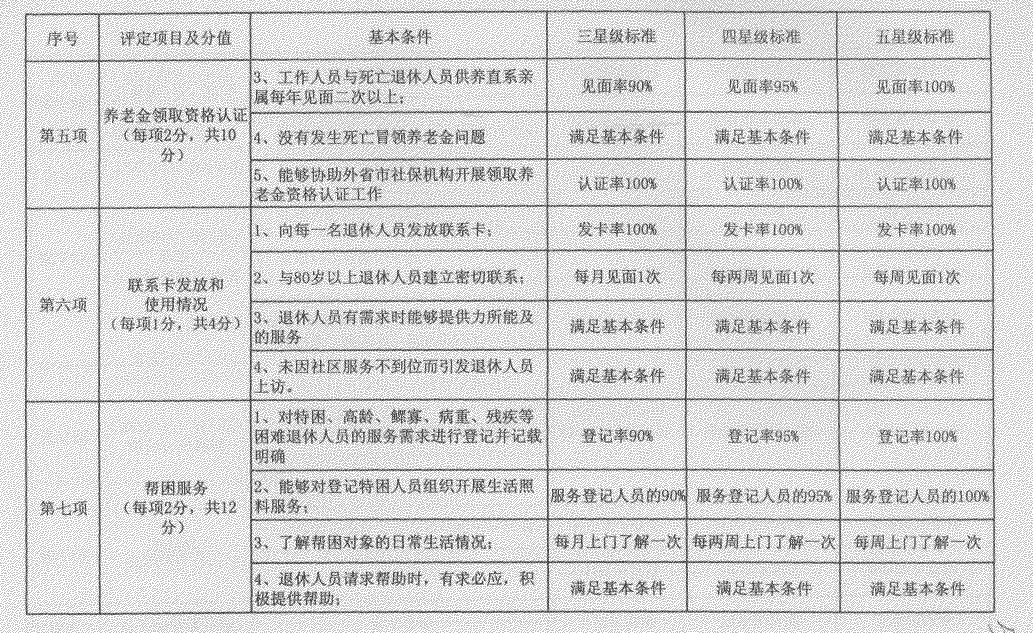 考核标准为基本条件加对应星级指标,考核评分在95分及以上的为“优秀”等次,85-94分为“良好”等次,75-84分为“合格”等次。连续两年考核优秀的社区,可以申请提高星级等级,普通社区可以申请三星级。连续两年考核在75分以下的,降低一个星级标准,其中三星级社区降为普通社区。