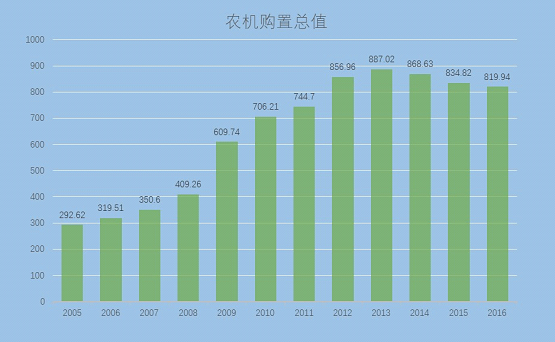 梳理2005年-2016年的农机购置总值,从292.62亿元增长到2013年的887.02亿元,到达顶峰,然后开始下降,到2016年是818.94亿元,即将跌破800亿元大关。这就是我们销售给市场终端的农机总价值,顶峰时期不到900亿元,再上升一个台阶,充其量不过1000亿元的市场。这个农业机械购置投入总值,包括了中央与地方的财政投入、单位和集体投入、农民个人投入以及其他投入。这才是衡量农机市场的数据。
