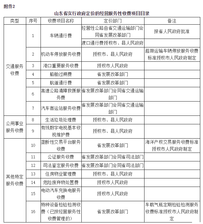 2.山东省实行政府定价的经营服务性收费项目目录
