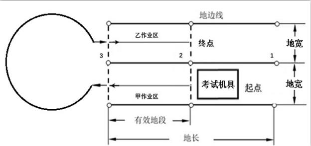考试机具从起点驶入甲作业区,在第2桩处正确降下农具或割台,直线行驶到第3桩处升起农具或割台,掉头进入乙作业区,在第3桩处正确降下农具或割台,直线行驶到第2桩处升起农具或割台,驶出乙作业区。