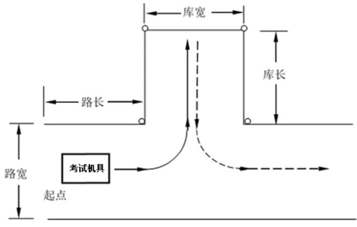 手扶拖拉机运输机组采用单机牵引挂车进行考试,其他机型采用单机进行考试。考试机具从起点前进,一次转弯进机库,然后倒车转弯从另一侧驶出机库,停在指定位置。