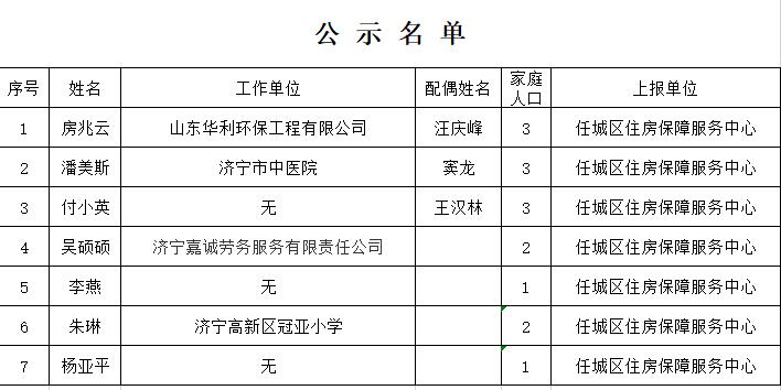 根据《济宁市城区公共租赁住房建设管理办法》(济政发[2015]25号),经审核,房兆云等7户家庭符合市城区公共租赁住房租赁补贴保障准入条件,依照工作程序,现予以公示,接受社会监督。公示期7天(公示日期自2021年10月25日至2021年10月31日)。经公示无异议或异议不成立的,我中心对列入公示名单的家庭予以登记,正式确定为住房租赁补贴保障对象。
