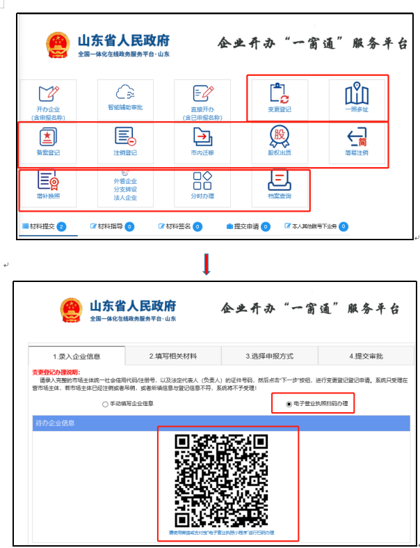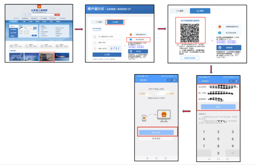 使用流程:访问企业开办“一窗通”服务平台(网址:http://www.shandong.gov.cn/col/col94091/)→选择“法人登录”→选择“电子营业执照”登录→使用微信或支付宝中电子营业执照小程序、爱山东APP、电子营业执照APP“扫一扫”功能扫描登录二维码进行登陆。