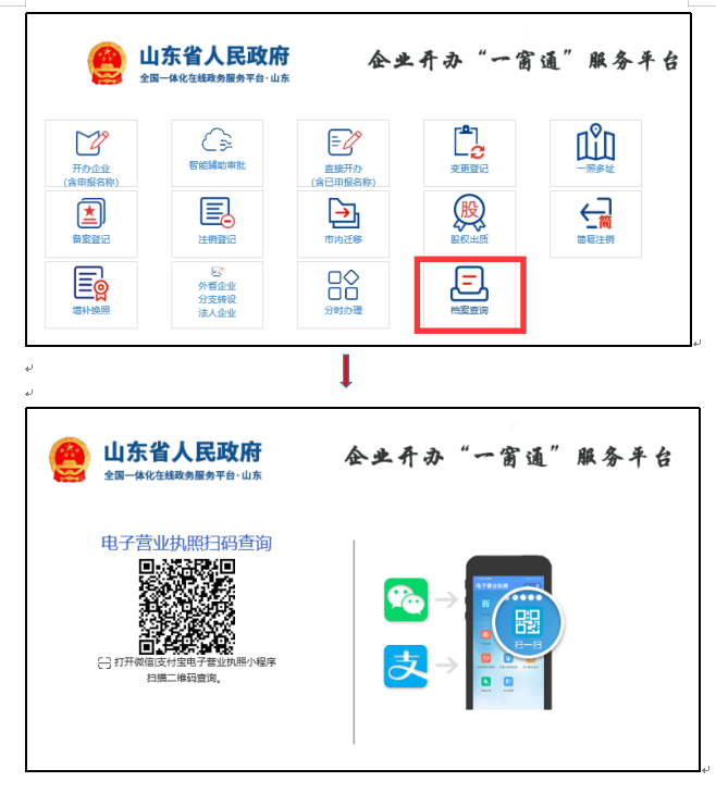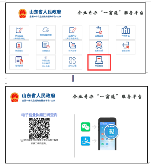 使用流程:访问企业开办“一窗通”服务平台(登陆方法见应用场景二)→选择“档案查询”→电子营业执照扫码查询。