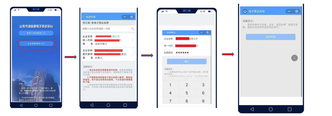 使用流程:经办人使用手机下载安装山东市场监管电子签名平台→选择企业签章登录入口→系统自动启动进入电子营业执照微信小程序→选择对应企业名称→输入6位数“执照密码”→点击“确认”→点击“返回应用”跳转回到电子签名平台界面→依据提示进行签名。通过山东省市场监管登记注册APP,进行登记注册过程中法人股东电子签名。