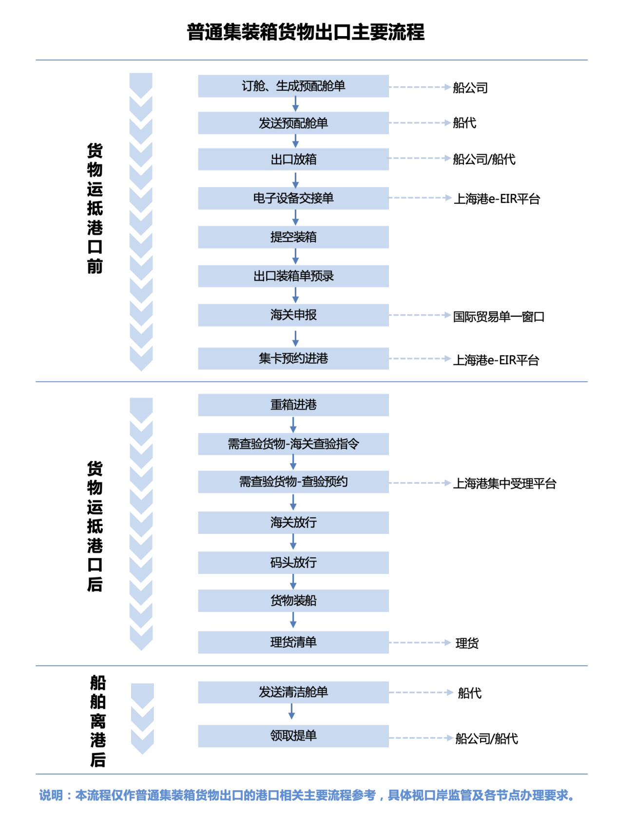 七 货物放行 | 1、自动触发放行信息 2、船公司装载放行 3、码头自动接收放行信息 | 海关、船公司、码头 | 即时 | ||