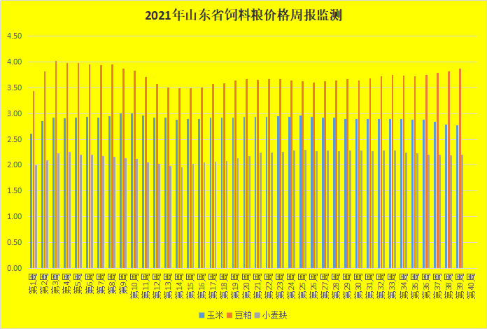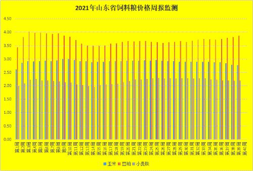 第39周,玉米价格继续下行,豆粕价格小幅上涨。截至39周末,玉米价格为2.77元/公斤,同比升高13.06%,环比回落0.72%;豆粕价格为3.88元/公斤,同比升高22.04%,环比升高1.57%;小麦麸震荡升高,为2.21元/公斤,同比升高22.10%,环比回升0.91%;进口鱼粉价格为12.90元/公斤,同比降低8.38%,环比升高0.08%。第39周,我省生猪、肉鸡、蛋鸡配合料继上周企稳后,全部走高。本周育肥猪配合饲料价格为3.54元/公斤,同比升高14.19%,环比升高0.28%;肉鸡配合料价格为3.74元/公斤,同比升高15.43%,环比升高0.27%;蛋鸡配合料为3.22元/公斤,同比升高17.95%,环比升高0.31%。