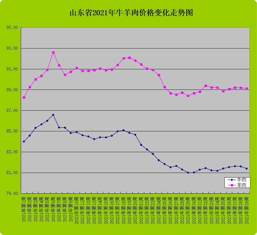 第39周,我省牛羊肉价格继续小幅回落。截至第39周末,牛肉价格为81.38元/公斤,同比降低0.86%,环比回落0.26%;羊肉价格为89.11元/公斤,同比升高5.21%,环比回落0.08%。