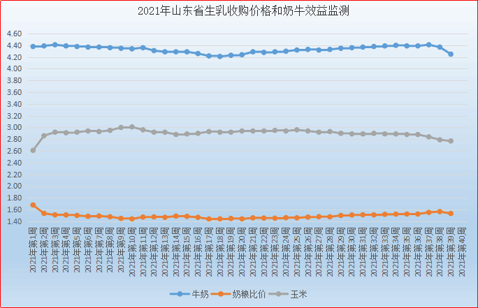 第39周(9月27日-10月3日),生乳价格继续回落下行。截至第39周我省生乳为4.35元/公斤,同比升高9.02%,环比降低0.46%。在我省监测的26个县中,剔除三个无效数据,有10个县的价格大于或等于全省平均价格,其中最高价格在潍坊安丘为4.86元/公斤;最低价格出现在文登为4.05元/公斤,最高价与最低价差值为0.81元/公斤,差价与上周相比扩大。本周奶粮比价为1.53:1,环比降低2.55%。