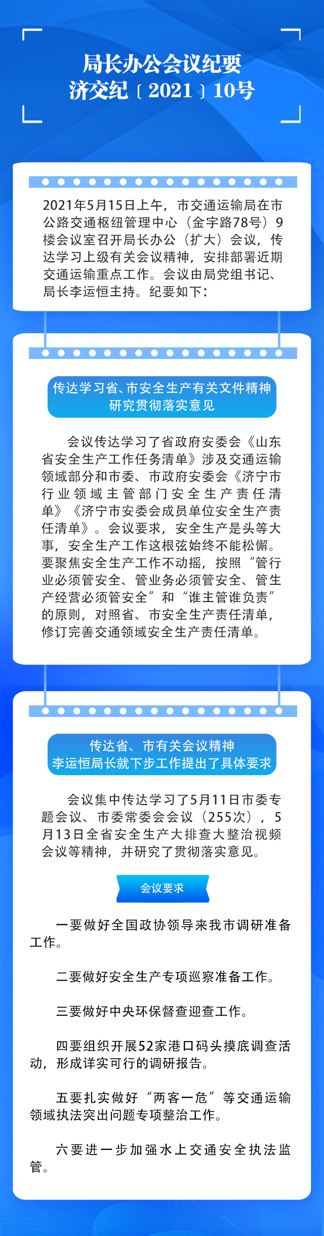 【市交通运输局】局长办公第十次会议纪要 济交纪﹝2021﹞10号