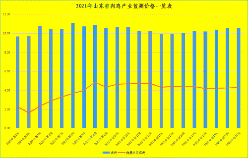 第21周肉雏鸡价格升高。截至第21周末,我省肉雏鸡均价为4.31元/羽,同比升高114.43%,环比升高1.41%,价格位于历史同期的相对高位,其中最高价地区是即墨区为6.50元/羽,最低区域价格聊城莘县0.65元/羽。由于高成本下养殖利润缩窄,近期补栏积极性或有所减弱,预计6月份肉雏鸡价格偏弱运行的几率略大。