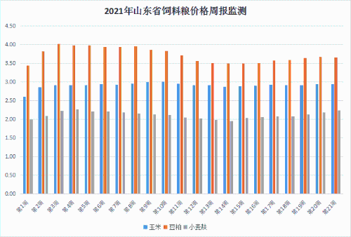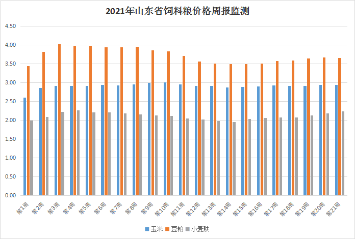 第21周,玉米价格探高后再次企稳。截止21周末为2.94元/公斤,同比升高35.48%,环比持平;豆粕价格连续两周升高后回落,为3.66元/公斤,同比升高21.19%,环比降低0.27%;小麦麸继续回升,为2.24元/公斤,同比升高48.34%,环比回升2.75%;进口鱼粉价格为13.17元/公斤,同比降低6.40%,环比回升0.92%。第21周,我省主要畜禽配合料呈现稳步升高态势。截止第21周,育肥猪配合饲料价格为3.48元/公斤,同比升高20.83%,环比回升0.87%;肉鸡配合料价格为3.64元/公斤,同比升高16.29%,环比升高0.55%;蛋鸡配合饲料继上周企稳后再次升高,价格为3.18元/公斤,同比升高23.26%,环比升高0.63%。