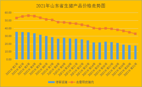 第21周(5月24日-5月30日),活猪价格继续承压回落,向下探底。据对全省26个集贸市场价格定点监测,截止第21周末全省生猪出栏均价为17.78元/公斤,同比降低33.01%,环比回落4.31%;全省猪肉价格继续走低,截止第21周均价为33.01元/公斤,同比降低30.03%,环比回落5.39%。饲料价格继续升高,生猪配合料价格为3.48元/公斤,环比升高0.87%。