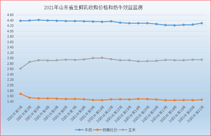 第21周(5月24日-5月30日),我省生鲜乳价格为4.29元/公斤,同比升高21.53%,环比升高1.18%。在我省监测的26个县中,剔除三个无效数据,有13个县的价格高于全省平均价格,其中最高价格在临沂郯城为4.80元/公斤;最低价格出现在桓台县、青州市和莱芜区,为4.00元/公斤,最高价与最低价差值为0.80元/公斤,差价与上周相比收窄,监测县奶价全部不低于4元/公斤。本周奶粮比价为1.46:1,环比升高1.39%。