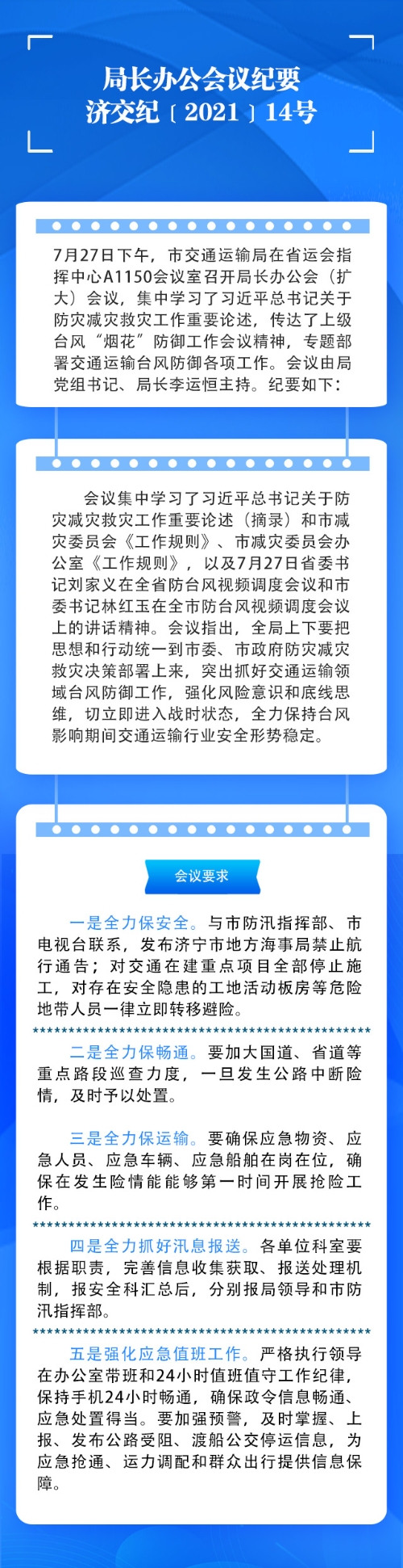 【市交通运输局】局长办公第十四次会议纪要 济交纪﹝2021﹞14号