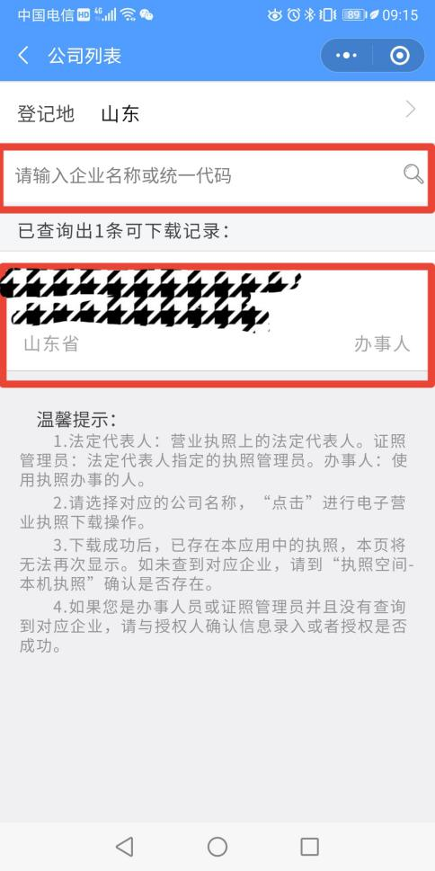 如果名下的公司不显示或者变更后信息未更新,可以编辑短信“本公司:山东XX有限公司,统一社会信用代码:91xxx,未生成/更新电子营业执照,请处理”发送至技术支持电话15921120657(此电话为山东地区客服)