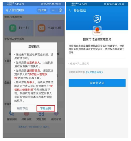 进入小程序,点击页面中【下载执照】。在服务授权页面,点击【同意并认证】,根据提示进行实名认证。其余步骤跟微信小程序一致。