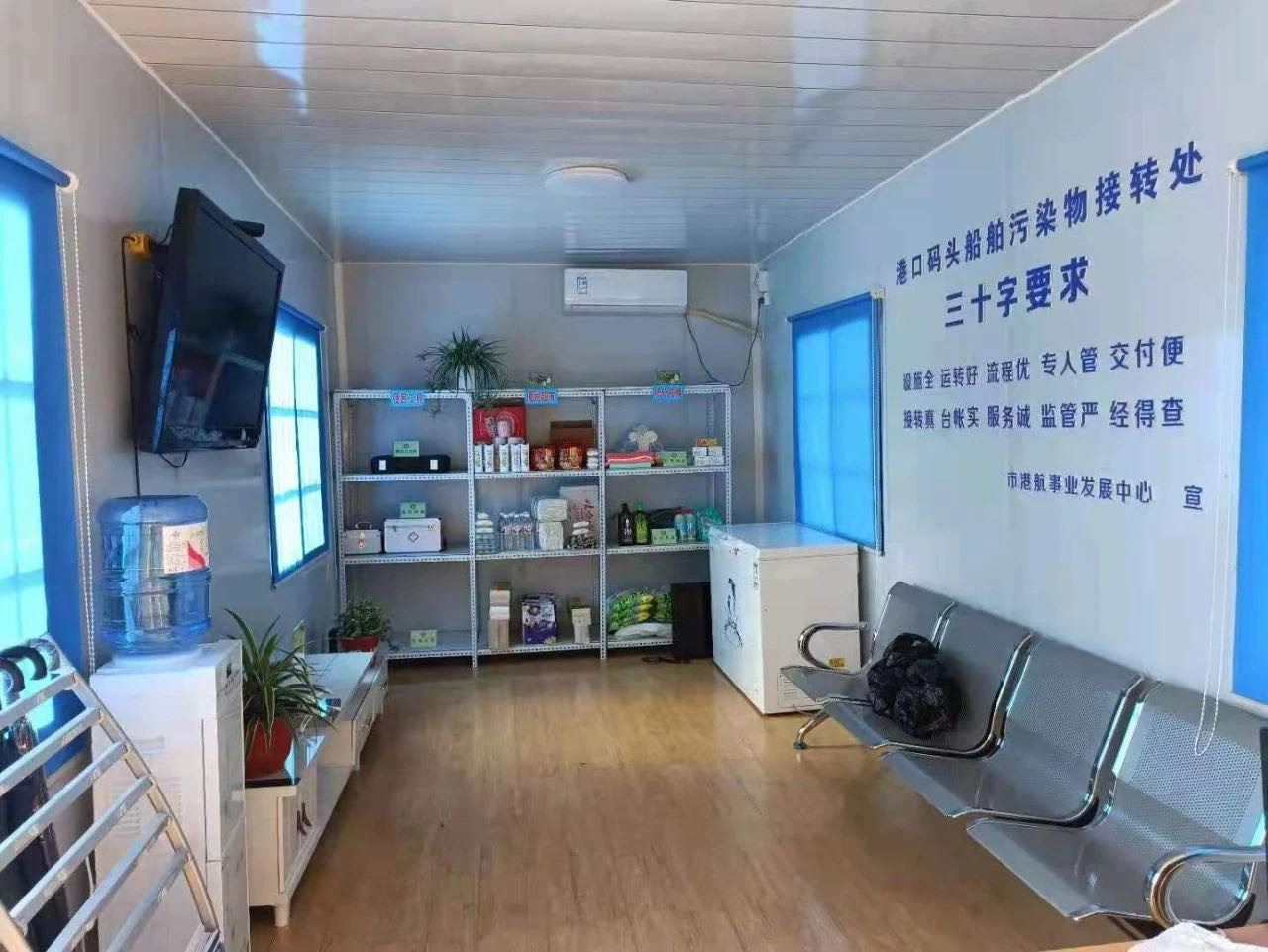 港口环保服务驿站由办公服务区、垃圾交付区、含油污水贮存区、接收车辆停放区等功能区组成,除具有免费接收船舶污染物、签注船舶防污染文书、宣传“济宁e交付”平台等功能外,还设立了舒适的生活服务区,配备了沙发座椅、便民单车、饮水机、便民药箱、便民工具箱、手机充电站等服务设施,可为船民提供淡水补给、政策宣传、物流信息、快递收发、无线网络、日用品采购等20余项服务,为船员提供多功能、人性化的“一站式”交付和便民服务。