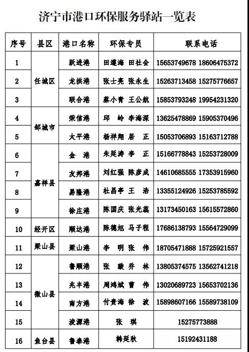 京杭大运河贯穿南四湖,船只来往密集,船舶产生的生活垃圾、生活污水和含油污水如果收集接收不到位,就会造成水体污染,严重影响南水北调东线工程调水安全。为贯彻落实党中央、国务院关于南四湖流域生态环境的重要指示,按照南四湖流域水污染综合整治三年行动方案有关要求,扎实做好港口船舶污染物接收、转运工作,济宁市港航事业发展中心指导辖区大型港口高标准建设了16处(一览表附后)港口环保服务驿站。