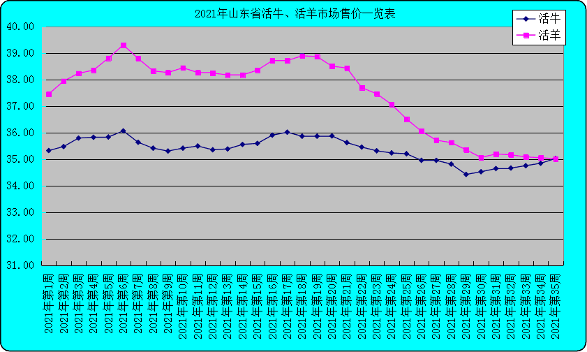 从活牛活羊市场来看,活牛价格继续走高,活羊价格上行。截至36周末,活牛为35.02元/公斤,同比升高2.25%,环比升高0.46%;活羊当前最低价为30.00元/公斤,最高达到42.00元/公斤,全省平均为35.01元/公斤,同比升高0.09%,环比上涨0.63%。
