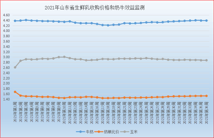 第36周(9月6日-9月12日),生鲜乳价格弱势回落后企稳。截至第36周我省生鲜乳为4.39元/公斤,同比升高11.42%,环比持平。在我省监测的26个县中,剔除三个无效数据,有12个县的价格大于或等于全省平均价格,其中最高价格在临沂郯城为5.00元/公斤;最低价格出现在文登,为4.10元/公斤,最高价与最低价差值为0.90元/公斤,差价与上周相比持平。本周奶粮比价为1.52:1,环比持平。