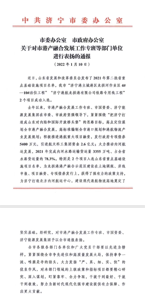 去年以来,市港产融合发展工作专班、市国资委、济宁能源发展集团在市委、市政府坚强领导下,紧紧围绕“把济宁打造成山东对内陆和国际开放桥头堡”的思路目标,高点定位谋划全市港产融合发展,高标准编制全市港口规划和港航物流产业发展规划;积极推进港航重大项目融资,发行政府专项债券5400万元,引进航天科工集团资金2.6亿元;大力推动内河航运发展,2021年完成内河水路运输货运量3355万吨、占全省水路货运量的78.3%。特别是2个项目入选山东省重点基础设施项目名单,为龙拱港港产融合示范区建设在土地调规、岸线申报、项目融资、专项债券发行上,获得了强有力的政策支持,为济宁打造北方内河航运中心,建设现代港航物流高地奠定了坚实基础。经研究,对市港产融合发展工作专班、市国资委、济宁能源发展集团予以全市通报表扬。