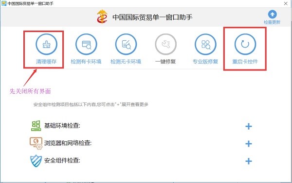 ②控件符合要求的话,可以通过“小助手”的“清理缓存”尝试恢复,在清理缓存前,请确保已经关闭浏览器所有界面,清除缓存后,点击重启卡控件后,重新进入系统