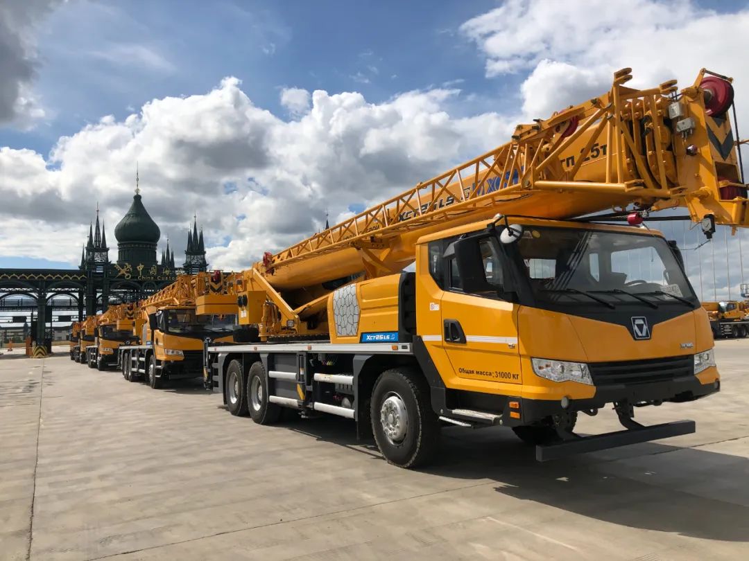 满洲里综合保税区准备出口的汽车起重机。图 / 王颖慧