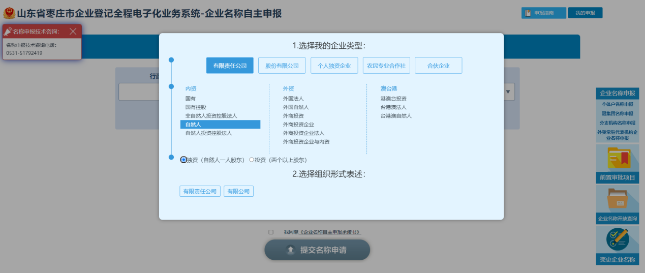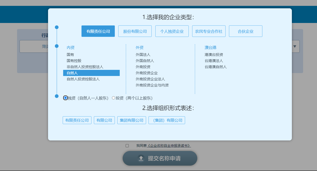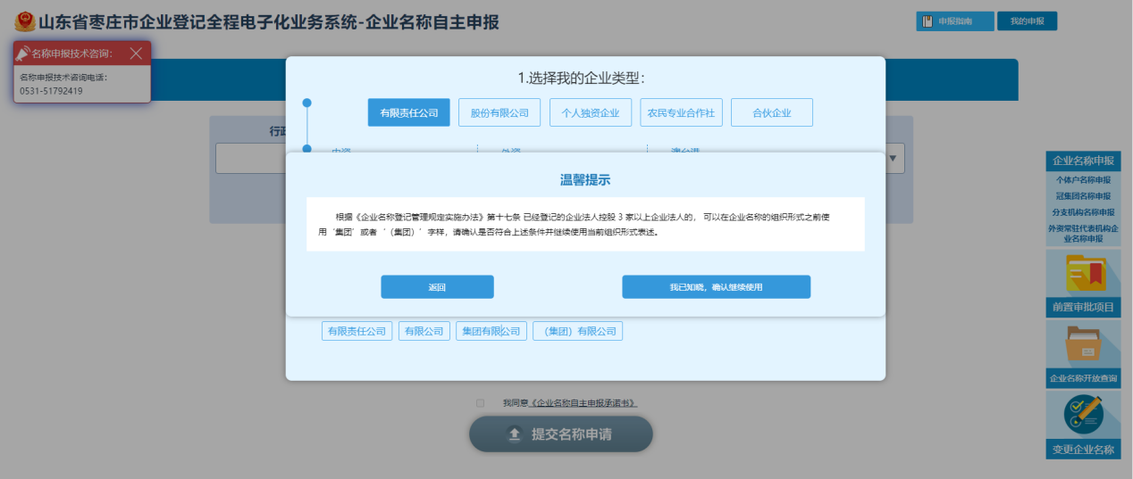 1.企业设立登记进行名称自主申报时,不能申报名称中含有“集团”或“(集团)”字样的企业名称(即,企业名称自主申报时,系统不再支持选择“集团有限公司”、“(集团)有限公司”、“集团股份有限公司”、“(集团)股份有限公司”等组织形式)。