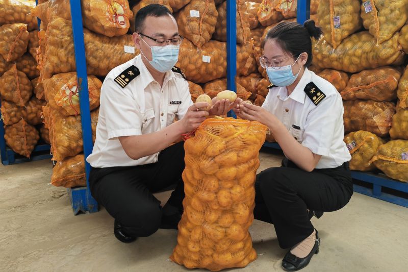 图为:济宁海关关员现场查验马铃薯 魏启蒙/摄