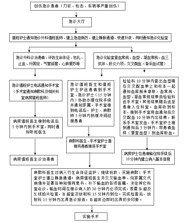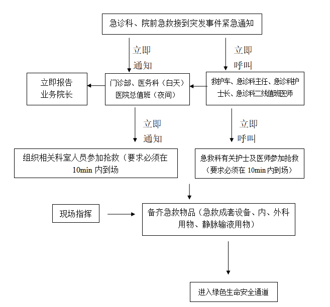 2、各临床医疗科室负责本科室专业伤患者转送入院时的救治力量和救治措施流程规范合理,负责在突发公共卫生应急事件处理时的紧急人员支援和紧急会诊,并在需要时迅速加入急救处理队伍中。