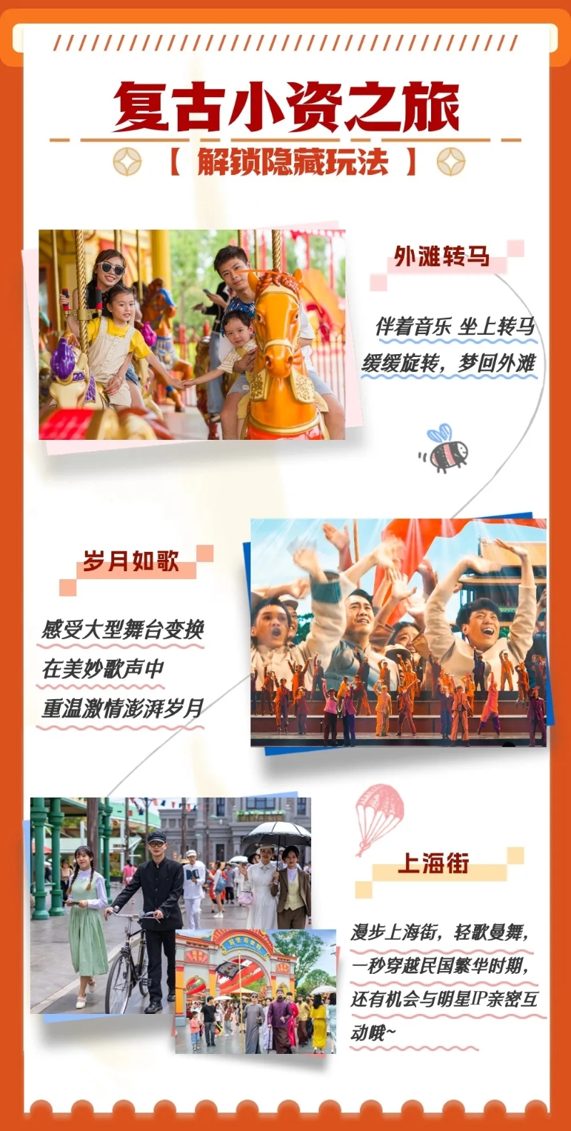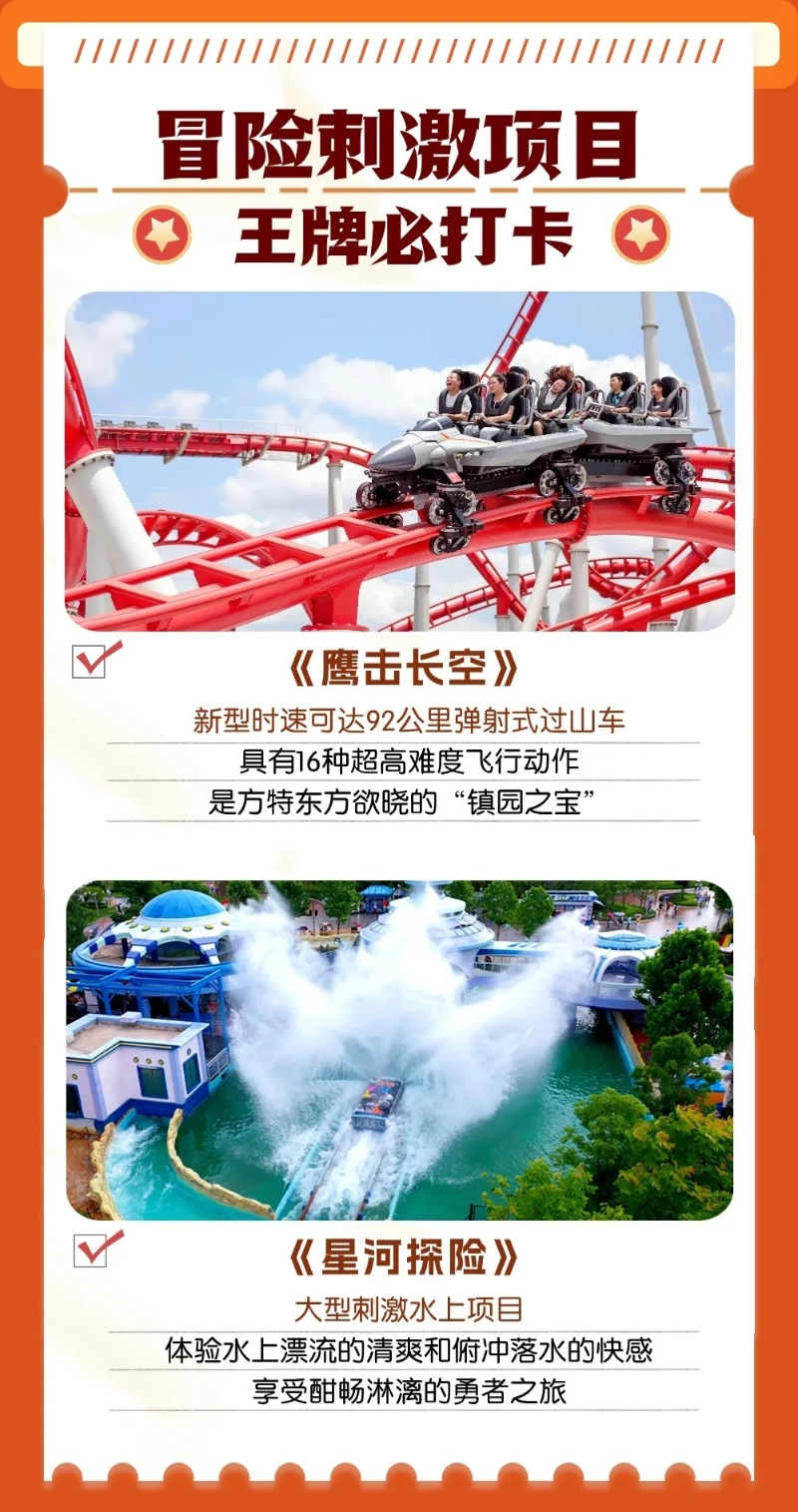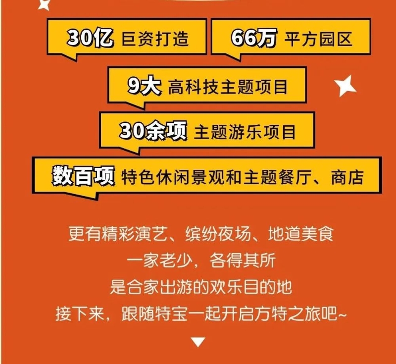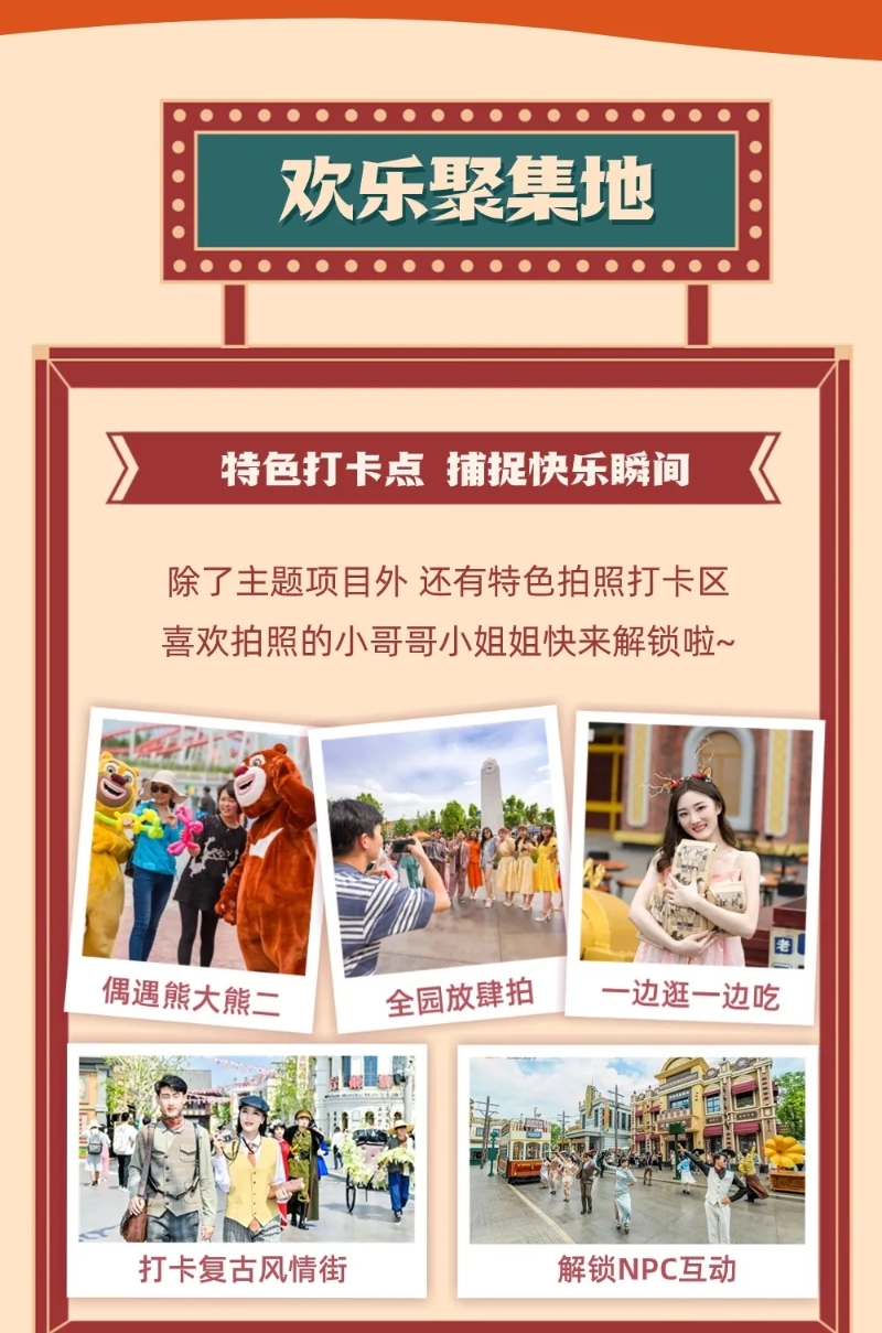 项目综合运用AR、VR、巨幕、球幕等行业前沿技术,打造出《圆明园》《致远 致远》《都会大剧院》《鹰击长空》《铁道游击》《飞翔》等一系列集参与性、互动性、体验性于一体的高科技游乐项目。园区内还有萌趣可爱、让小朋友流连忘返的《熊出没》主题区,更有各种精彩演艺、缤纷夜场活动、特色美食餐厅,可以为全年龄层游客提供“一站式”休闲旅游服务,是适合合家出游的欢乐目的地。