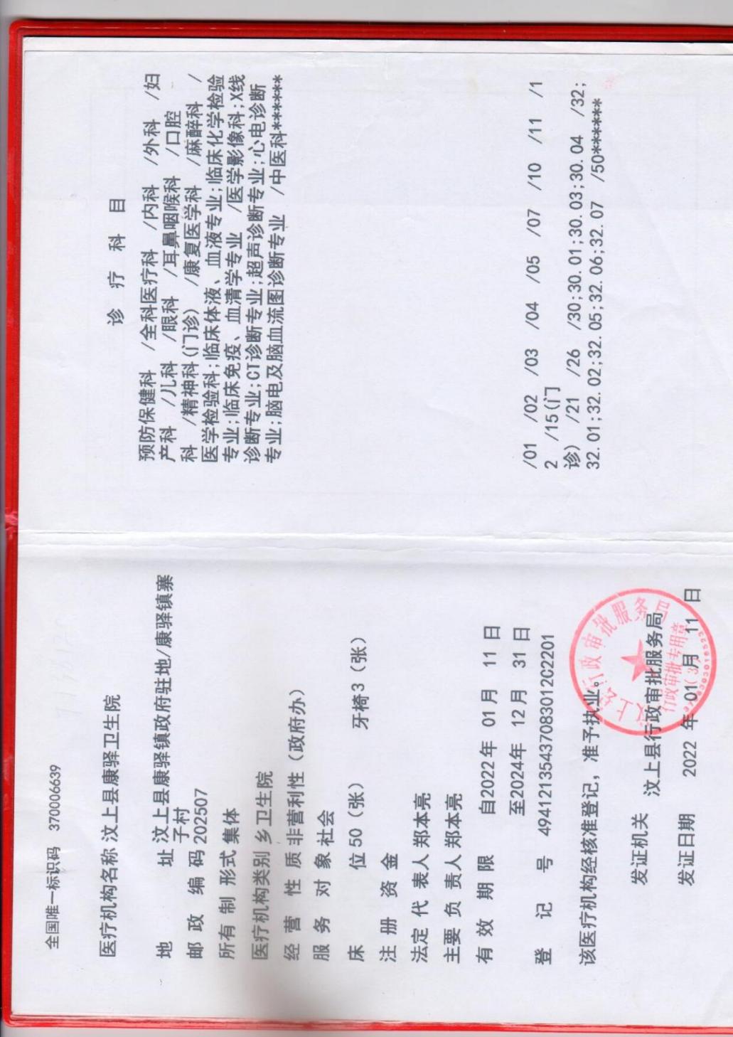 医院简介 | 一、历史沿革 汶上县康驿卫生院成立于1958年,是汶上县境内南部乡属集体性质的卫生院。2019年评审为“一级甲等”卫生院,是一所综合性公立卫生院。汶上县康驿卫生院与汶上县人民医院是紧密型医共体。卫生院西院区开展医养结合服务。 二、诊疗项目、科室概况 康驿卫生院分总院区和西院区,开设临床医技科室有外科、内儿科、妇科、中医科、针灸康复科、口腔科、眼科、产后保健科、影像科、检验科、公共卫生科等16个科室;设置床位99张、牙椅3张。 三、设备人员概况 康驿卫生院专业技术人员共108人,医师(含助理医师)43人,注册护士32人,其他卫生专业技术人员33人。工勤12人。康驿卫生院配置有32排螺旋CT 、DR 、多普勒彩超、全自动生化分析仪、电子胃镜等先进设备。 四、公共服务职能 负责康驿镇辖区内居民健康档案管理服务、健康教育服务、预防接种服务、0~6岁儿童健康管理服务、孕产妇健康管理服务、老年人健康管理服务、高血压患者健康管理服务、严重精神障碍患者管理服务、肺结核患者健康管理服务、中医药健康管理服务老年人中医药健康管理服务、传染病及突发公共卫生事件报告和处理服务、卫生计生监督协管服务十二项国家基本公共卫生服务职能。 | ||