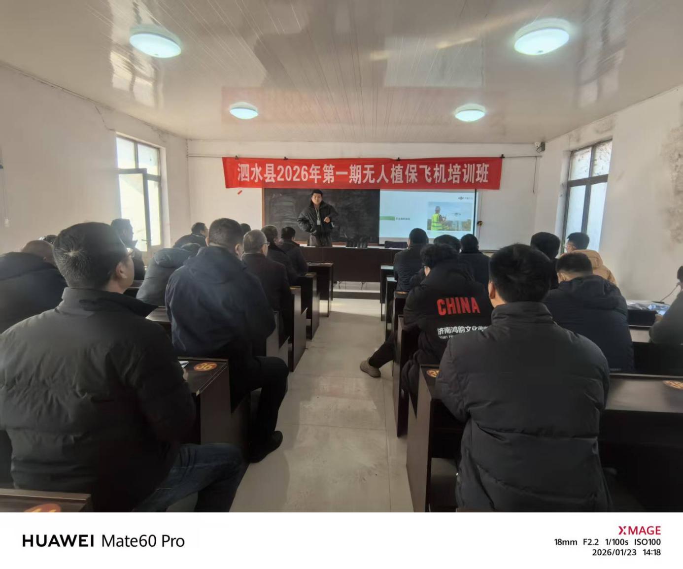 为加快智慧农业发展步伐,提升农机从业人员智能装备操作技能,规范农用植保无人机作业流程。近日,泗水县农机中心联合慧飞无人机应用技术培训中心利用冬闲时间“充电”,举办2026年第一期农用植保无人机培训班。来自全县各乡镇农机手、种植大户、农机合作社骨干共计20余名学员参加培训。