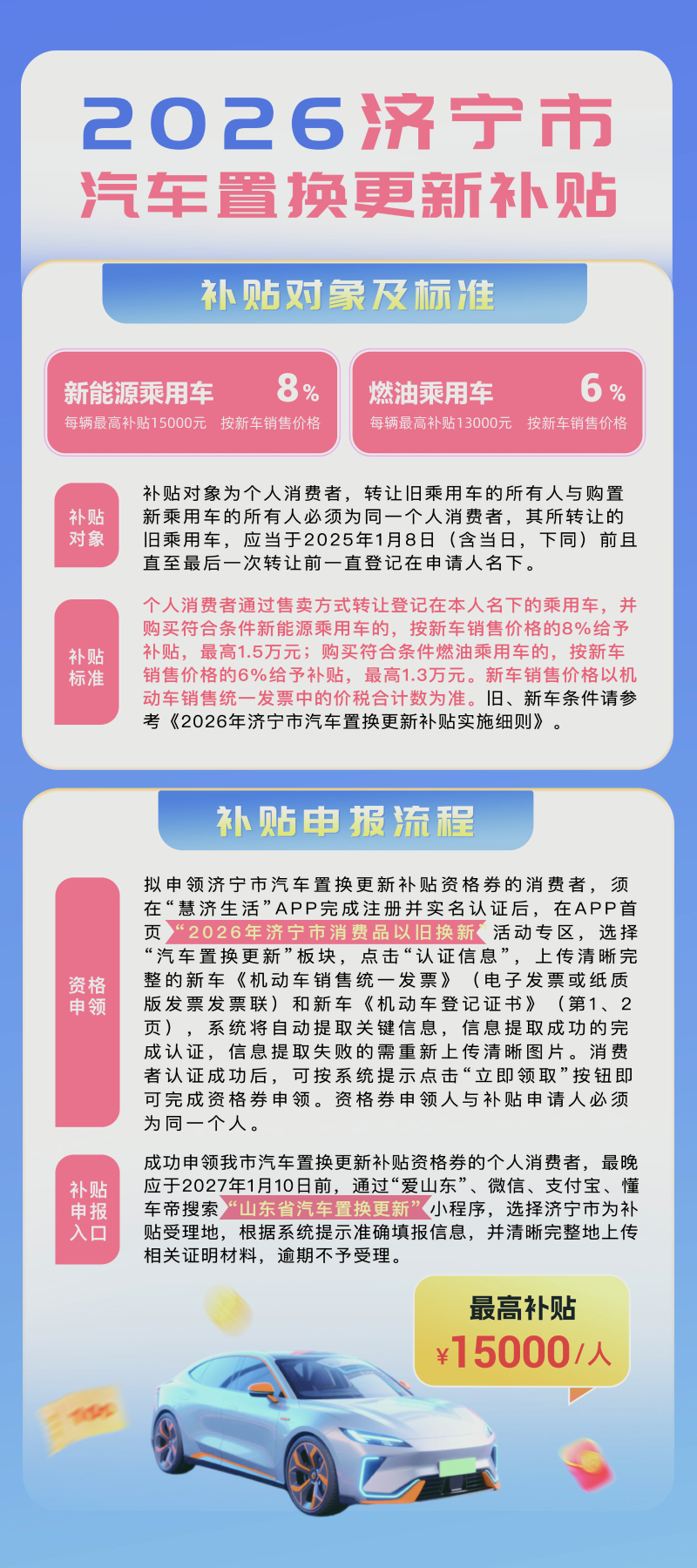 《2026年济宁市汽车置换更新补贴实施细则》:http://business.jining.gov.cn/art/2026/1/30/art_6669_2708732.html