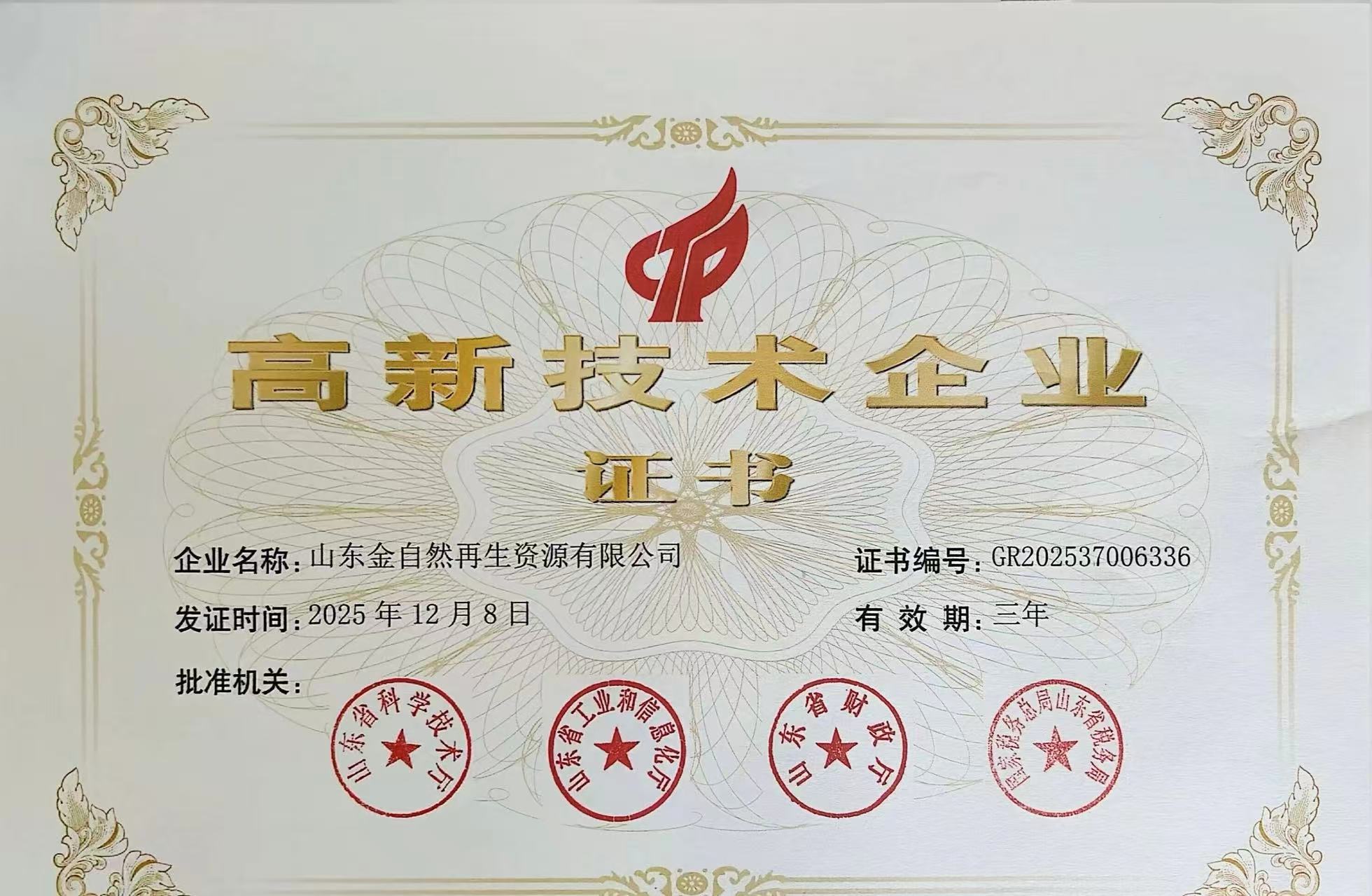 [金乡]喜报!山东金自然再生资源有限公司荣获省级高新技术企业认定