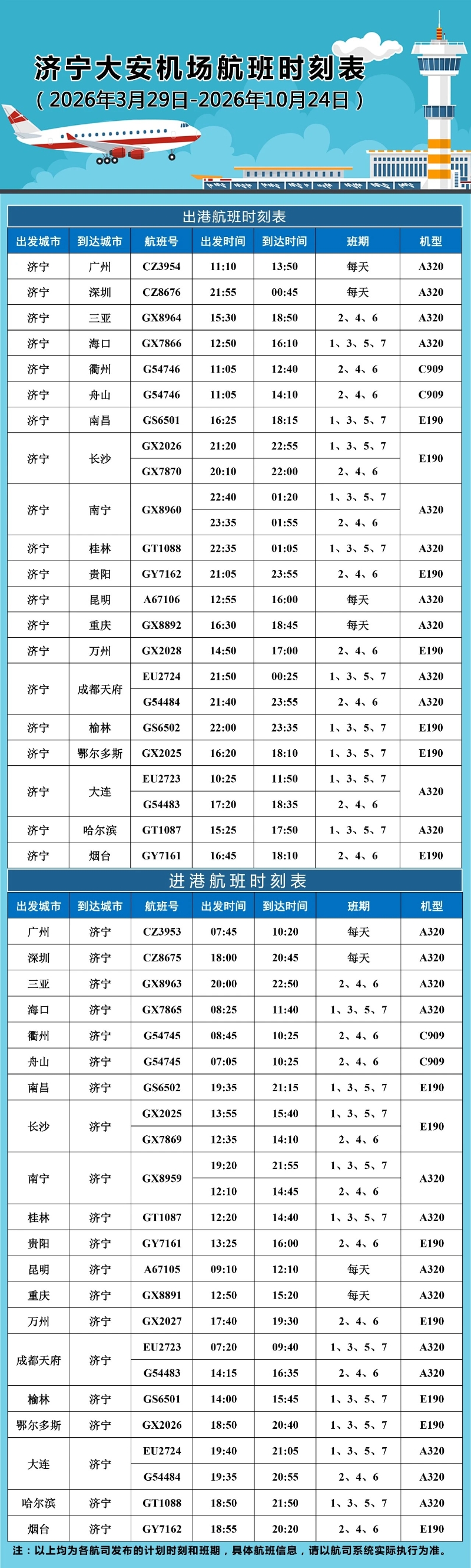 济宁大安机场航班时刻表(2026年3月29日-2026年10月24日)